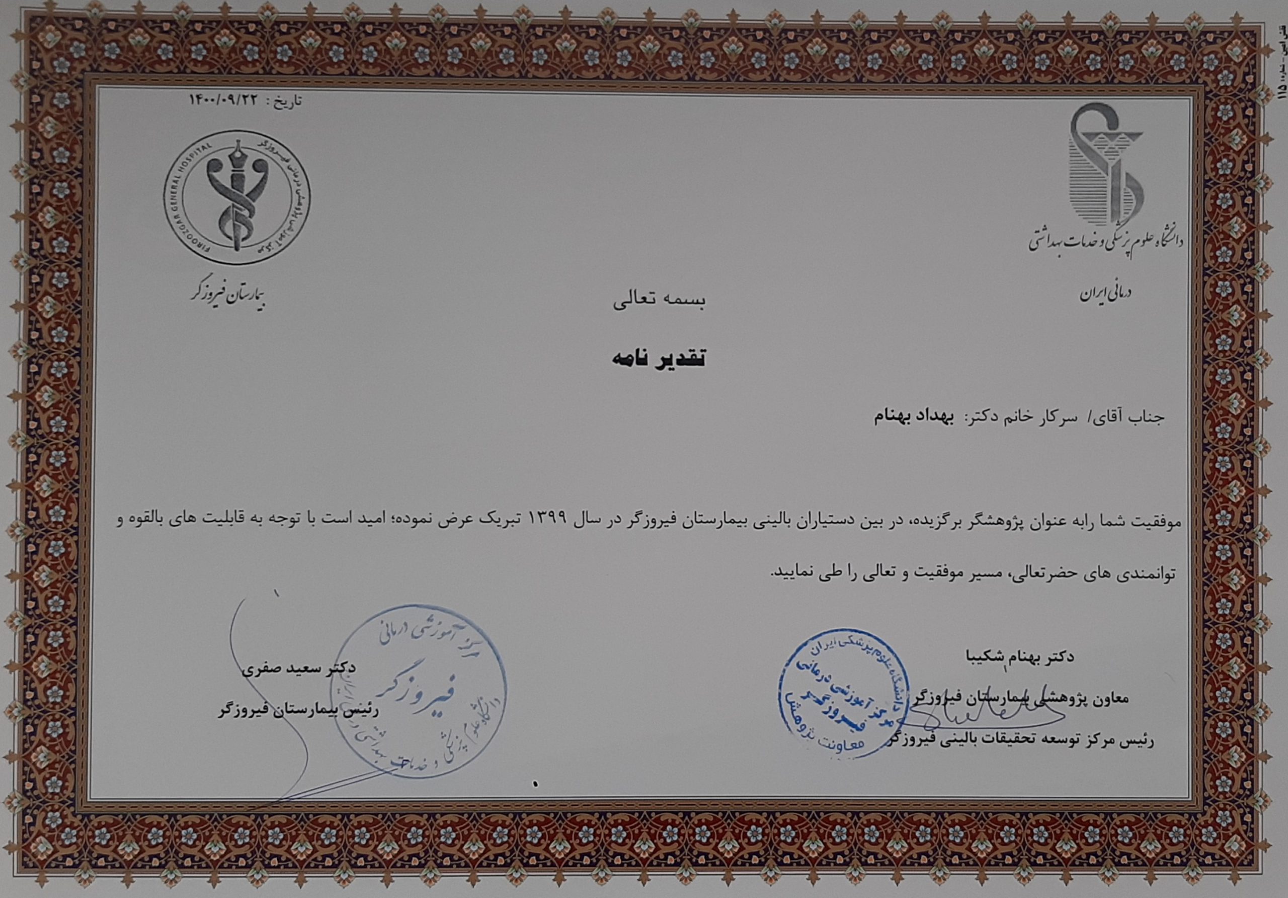 پژوهشگر برجسته بیمارستان فیروزگر تهران (سال ۱۴۰۰)